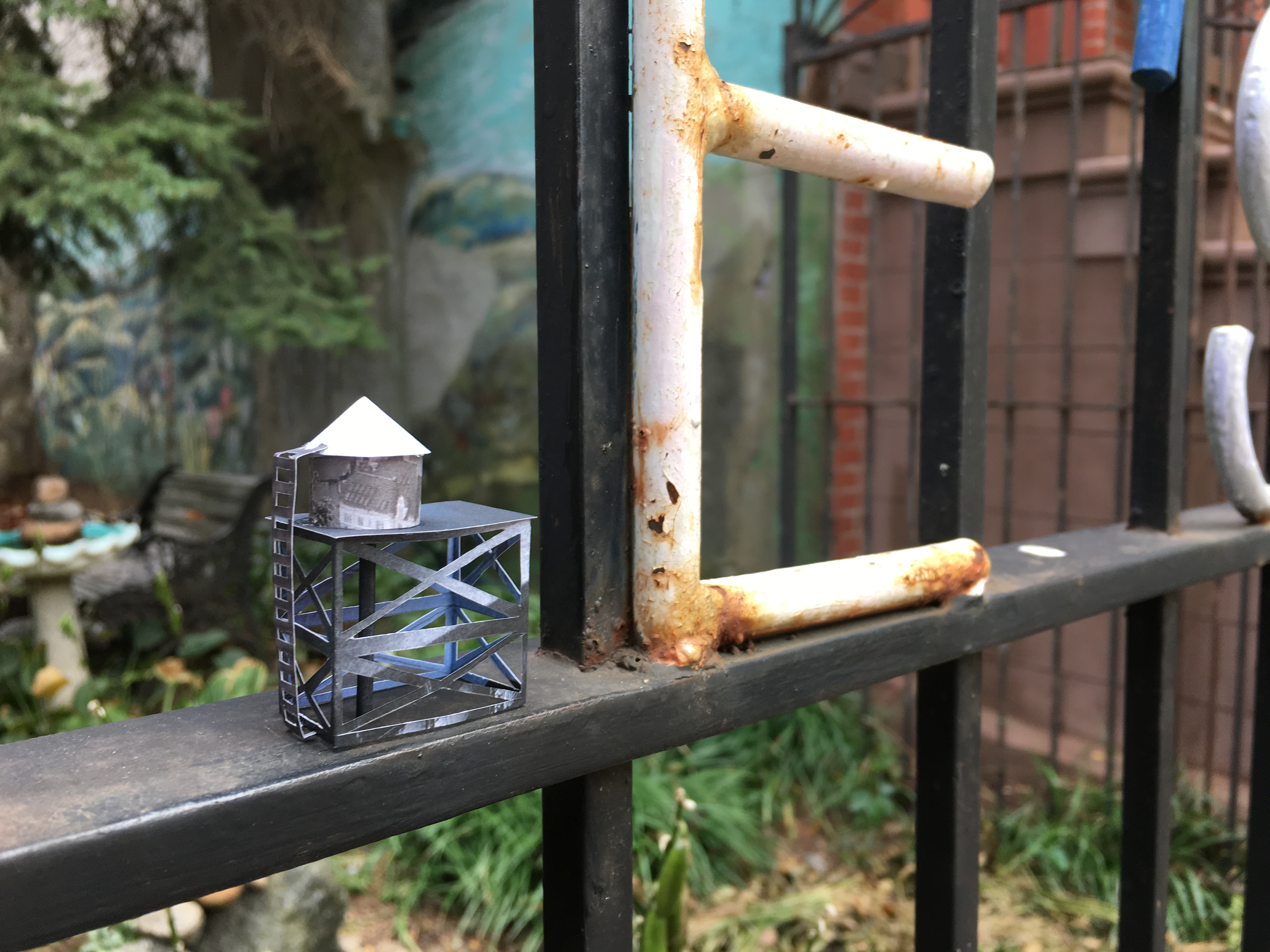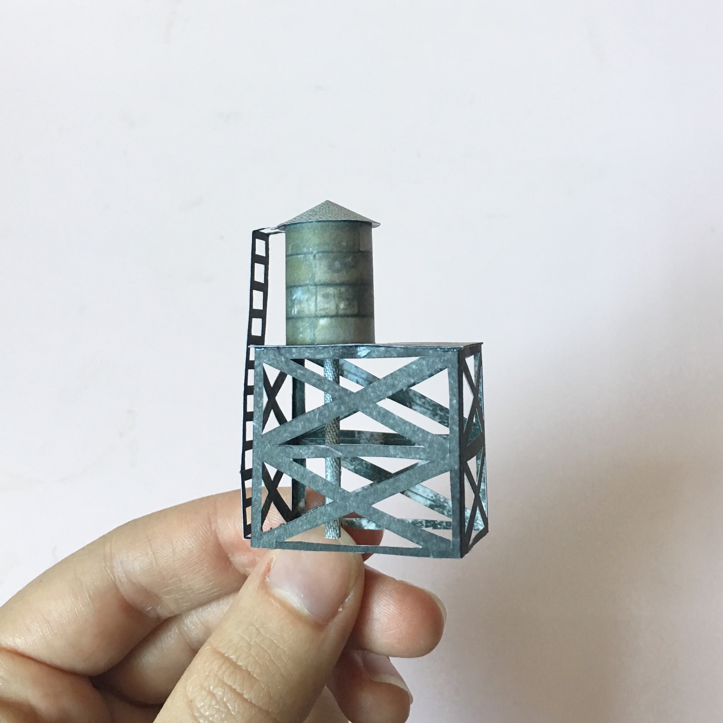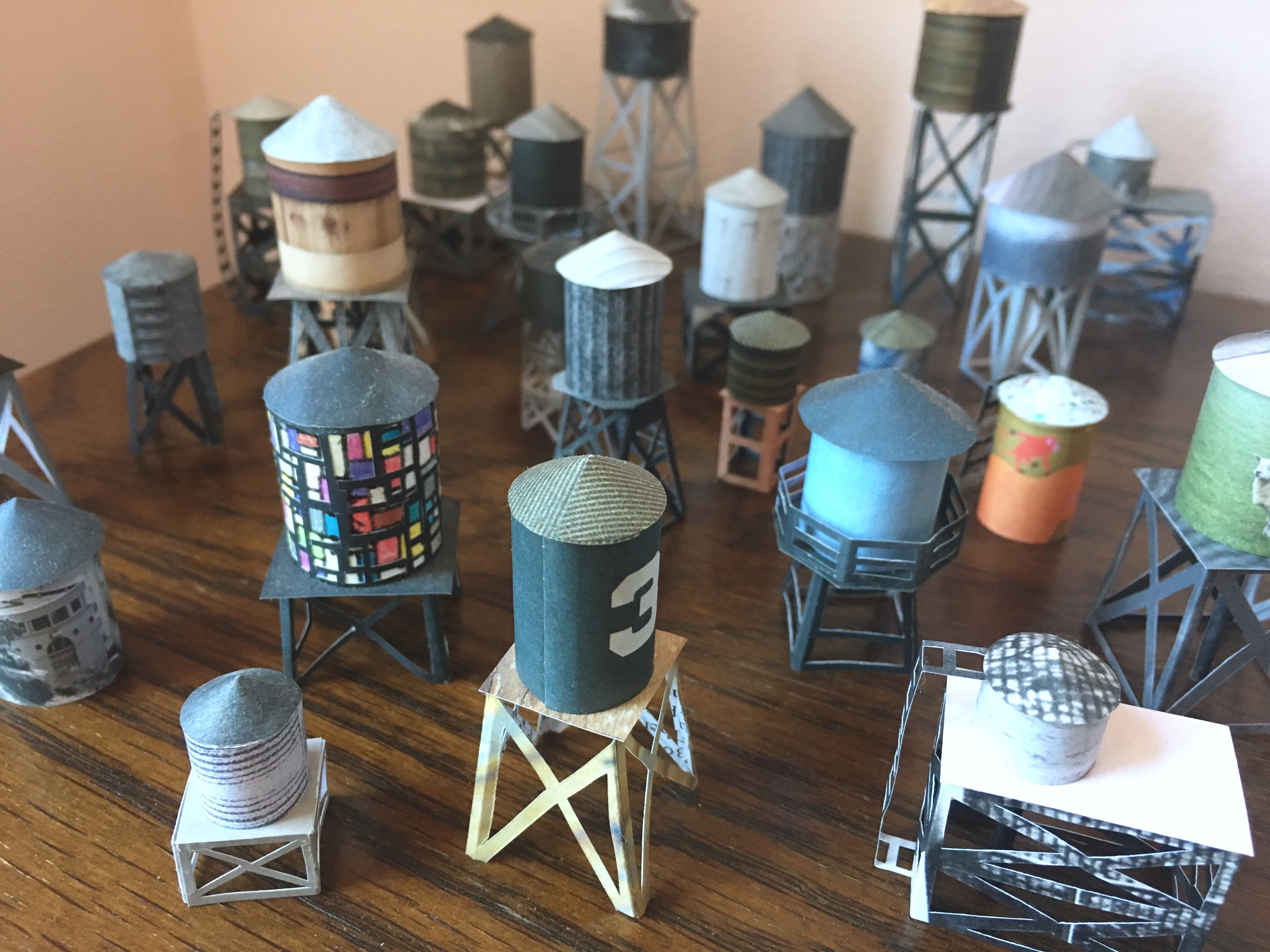 Each water tower is made from discarded magazines and catalogues, and cut and assembled by hand.