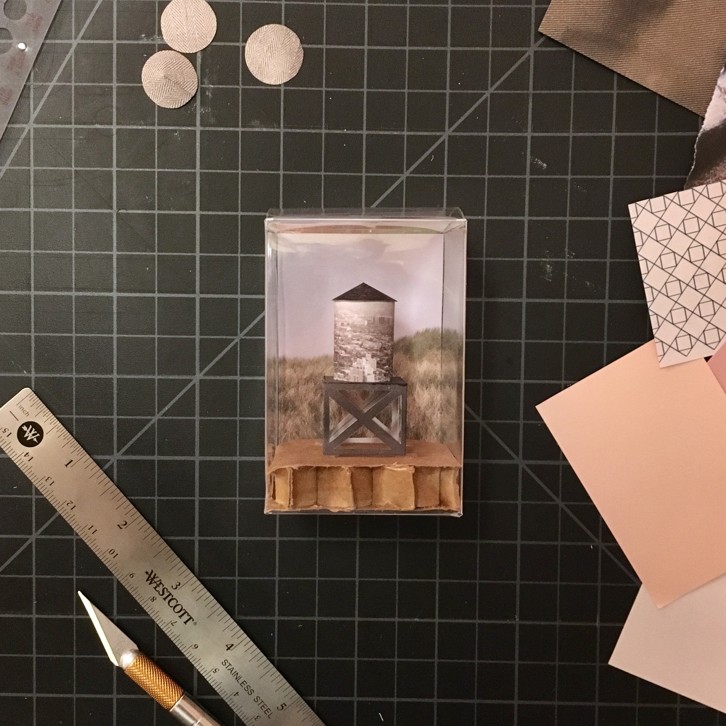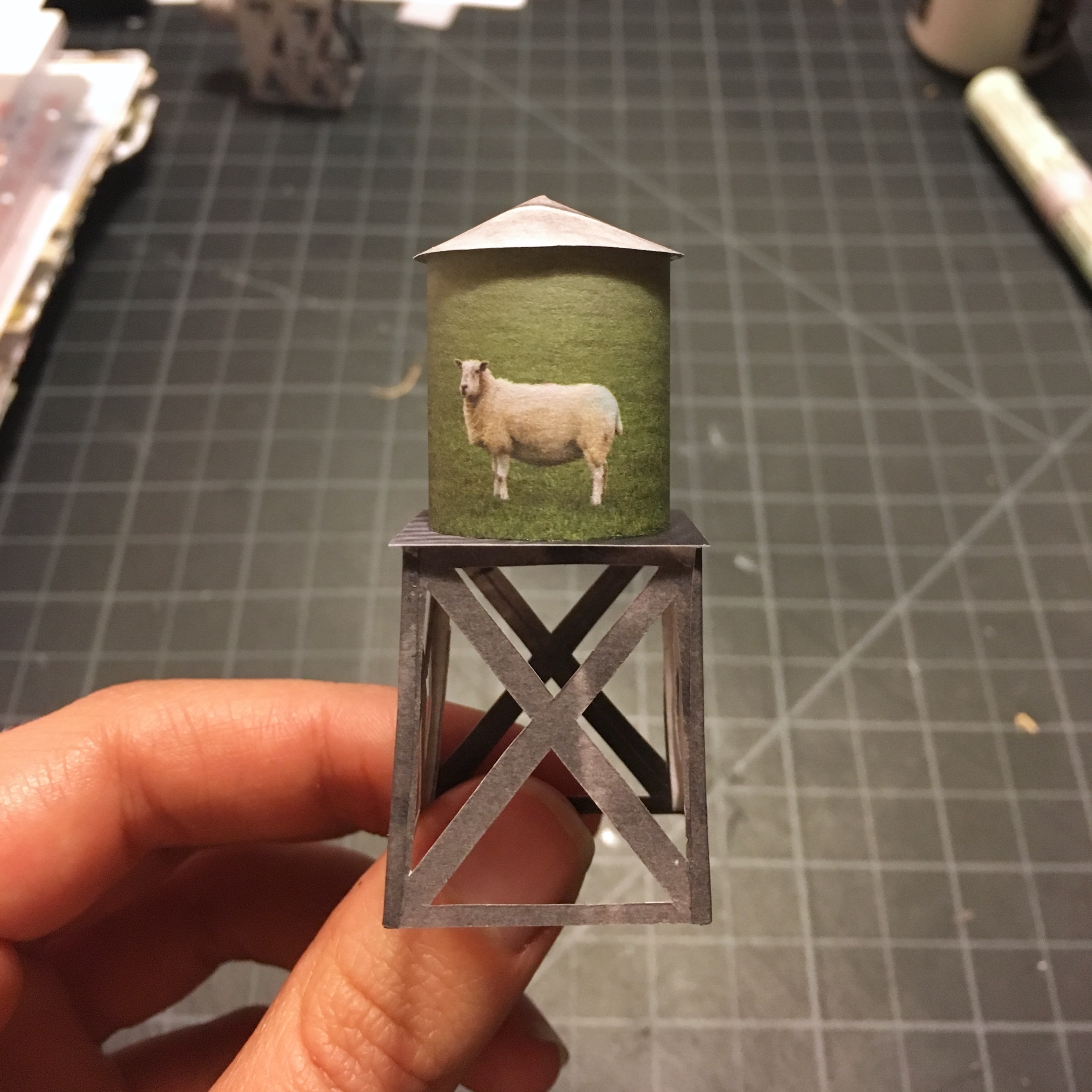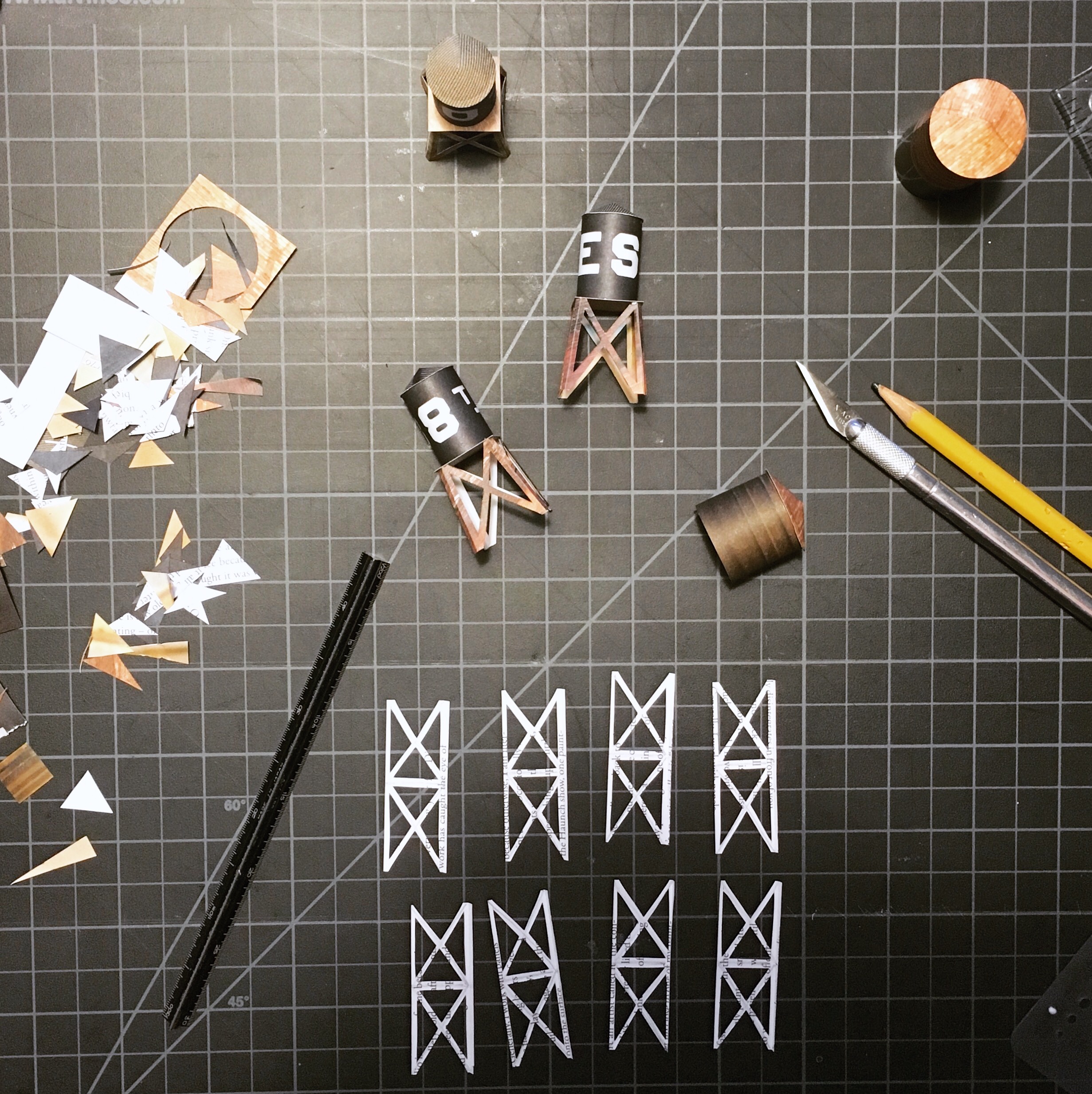 Each water tower is made from discarded magazines and catalogues, and cut and assembled by hand.
